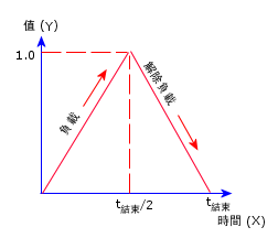 負載乘數 (Y 值) 從時間 0 至時間 tend/2 從 0 增加到 1,再於時間 tend 減少到 0,其中 end 是非線性分析的結束時間,或是暫態熱分析的總時間。