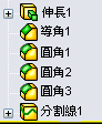 例如,在此模型中,您在前表面上插入一條分割線作為 FeatureManager(特徵管理員) 中的最後項次。如果您重新排序分割線 1 以遵循伸長 1 特徵,則模型會保留下游導角和圓角。
