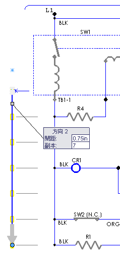 • 按一下反轉方向 來沿著直線的延伸產生複製排列。 例如,如果您設定角度為 45,按一下反轉方向會產生從註解開始沿著 225º 線的複製排列。 當您按一下反轉方向角度的值會更新。 您也可以在圖面中按一下控制點 來反轉方向。