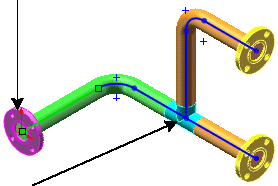 變更路線 PropertyManager 出現。路線線段在圖面中被強調顯示。最靠近您在路線線段上所選位置的接頭出現在第一個接頭之下,顏色是粉紅色的;第二個接頭是藍色的。