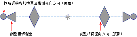 不規則曲線控制點包括多種控制點類型,以控制在該點的不規則曲線的權重和方向(向量)。 您可以控制權重及方向:
