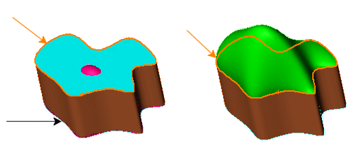 Vous sélectionnez le profil supérieur pour le remplissage de surface de type tangent (flèche orange), mais la surface est attachée au profil inférieur (flèche noire).
