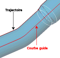 Segmenter le corps balayé à tous les points où la courbe guide ou bien la trajectoire ne présente pas une courbure continue (voir l'exemple ci-dessous). Il en résulte une transition plus douce entre les lignes et les arcs des courbes guides.