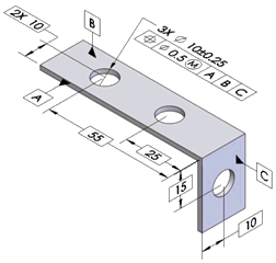Le schéma de cotation illustré a été créé au moyen de l'outil Schéma de cotation automatique, en utilisant A en tant que référence primaire et B en tant que référence secondaire. Remarquez la tolérance de perpendicularité qui est appliquée à la référence B par rapport à la référence A.