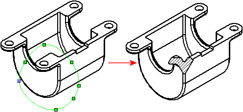Ein Ausbruch ist keine separate Ansicht, sondern Teil einer vorhandenen Zeichenansicht. Ein geschlossenes Profil, normalerweise ein Spline, definiert den Ausbruch. Dabei wird Material bis zu einer bestimmten Tiefe entfernt, um innere Details freizulegen. Sie können die Tiefe bestimmen, indem Sie eine Zahl angeben oder Geometrie in einer Zeichenansicht auswählen.