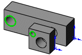 Im folgenden Beispiel besteht zwischen den rechtsseitigen Bohrungen der zwei Teile eine konzentrische Beziehung. Wenn Sie versuchen, eine zweite konzentrische Beziehung den grün angezeigten, linksseitigen Bohrungen hinzuzufügen, ist die Baugruppe überdefiniert, weil der Abstand zwischen den Bohrungen an einem Teil nicht mit dem Abstand zwischen den entsprechenden Bohrungen am anderen Teil identisch ist.