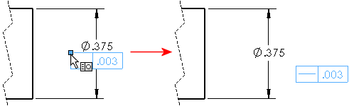 • Sie können Symbole geometrischer Form- und Lagetoleranzen mit oder ohne Bezugslinien, an einer beliebigen Stelle in einer Zeichnung, einem Teil, einer Baugruppe oder Skizze platzieren und an einer beliebigen Stelle einer Bemaßungslinie anfügen.