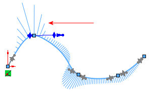 Krümmungsradius. Steuert den Krümmungsradius an einem beliebigen Spline-Punkt. Krümmungsradius wird angezeigt, wenn Sie Krümmungssteuerung hinzufügen von der Symbolleiste Spline-Werkzeuge oder dem Kontextmenü auswählen und einen Krümmungs-Cursor zum Spline hinzufügen.
