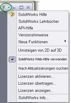 Die Menüs werden eingeblendet, wenn Sie den Cursor über das SolidWorks Logo bewegen oder darauf klicken. bsp;Sie können die Menüs auch mit dem Stecknadelsymbol anheften, um sie jederzeit sichtbar zu haben. Wenn die Menüs angeheftet sind, wird die Symbolleiste nach rechts verschoben.