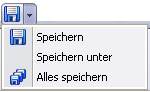Wenn Sie neben einer Werkzeugschaltfläche auf den Pfeil nach unten klicken, wird diese erweitert, und ein Flyout-Menü mit zusätzlichen Funktionen wird angezeigt. Auf diese Weise können Sie von der Symbolleiste auf die meisten Befehle im Menü Datei zugreifen. So enthält beispielsweise das Flyout-Menü Speichern die Befehle Speichern, Speichern unter und Alles speichern.