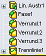 Im folgenden Modell fügen Sie z. B. eine Trennlinie auf der vorderen Fläche als letztes Element im FeatureManager ein. Wenn Sie Trennlinie1 neu anordnen und direkt unter Lineare Austragung1 platzieren, behält das Modell die nachfolgende Fase und die Verrundungen bei.