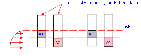 Die Auflagerkraft wird, wie in der Abbildung schematisch dargestellt, auf die ausgewählten zylindrischen Flächen angewendet. Beachten Sie, dass die Auflagerkraft normal auf die Fläche angewendet wird und dass Sie auch runde Schalenkanten auswählen können. Angenommen, die ausgewählte Fläche A1=A2 und A3=A4. Auf A2 wird aufgrund ihrer Position der maximalen Intensität im Halbraum mehr Kraft ausgeübt. Ebenso wird auf A4 mehr Kraft ausgeübt als auf A3. Das von A1 und A3 empfangene Kräfteverhältnis ist direkt proportional zu ihren Bereichen, da sie dieselben relativen Positionen im Halbraum in Anspruch nehmen. Das Gleiche gilt für A2 und A4.