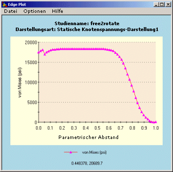 Das Fenster Kantendarstellung wird geöffnet. Es zeigt Werte des angezeigten Ergebnisses (Y-Achse des Diagramms) in Abhängigkeit vom parametrischen Abstand auf der gewählten Kante normalisiert zu 1 (X-Achse).