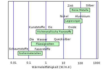 zeigt die Wertebereiche der Wärmeleitfähigkeit für Flüssigkeiten, nichtmetallische Feststoffe und reine Metalle bei normaler Temperatur und normalem Druck.