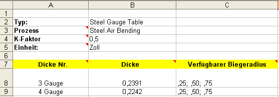 Die SolidWorks Anwendung enthält Tabellen in folgendem Ordner: <Installationsverzeichnis>\lang\<german>Sheet Metal Gauge Tables\.