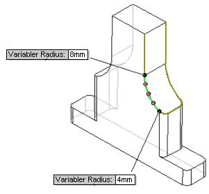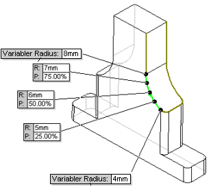 Sie können Radiuswerte ändern und den Steuerpunkten zwischen den Eckpunkten eine Verrundung mit variablem Radius zuweisen.
