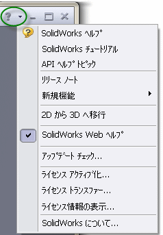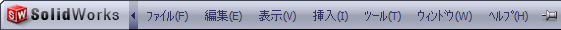 SolidWorks ロゴをクリックするか、マウスを上に持っていくとメニューを見ることができます。 bsp;いつでもメニューを表示しておくためにメニューを留めておくことができます。メニューが留められると、ツールバーは右へ移動します。