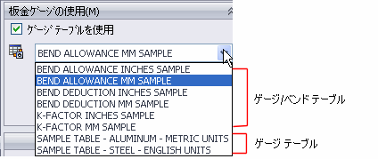 しかし、デフォルト値と異なる厚みとベンド半径値を板金ゲージ/ベンド テーブルでエッジフランジのような、特定のフィーチャーに適用することができます。