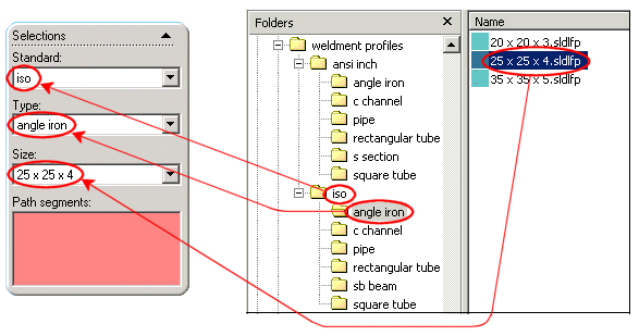 溶接輪郭ファイルのデフォルト位置は<インストール_ディレクトリ>\data\weldment profiles です。鋼材レイアウトPropertyManagerに表示される選択肢は、weldment profiles(溶接輪郭)内のサブフォルダー構成によって決まります。PropertyManagerの選択アイテム(Selections)ボックスの各アイテムに対応するファイル構成(Windows エクスプローラ)は次のようになります: