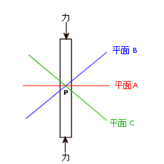 下図の棒モデルを考えます。 ポイントPの応力状態は任意の平面で明記することができます。 すべての場合で合力は同じとなりますが、応力成分の値は任意の平面に依存します。