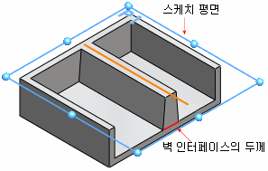 보강대 두께 . 구배를 추가하면 스케치 평면에서나 벽 인터페이스에서의 두께를 지정할 수 있습니다.