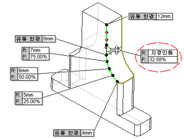 유동 반경 필렛의 꼭지점들 사이에 있는 통제점에 반지름을 지정하여 조절할 수 있습니다.