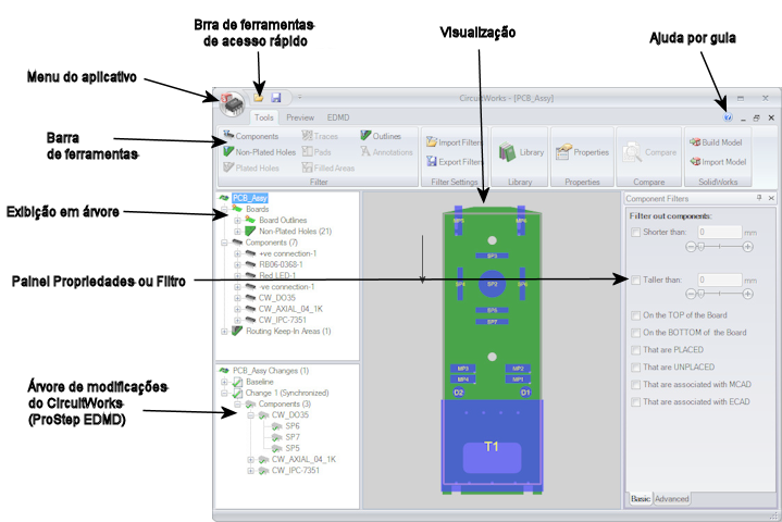 Quando você abre um arquivo ECAD no SolidWorks, a janela do CircuitWorks é aberta. Use esta interface para abrir, comparar e salvar arquivos ECAD, filtrar recursos para reduzir a complexidade, modificar propriedades ECAD e construir modelos de peças e montagens do SolidWorks.