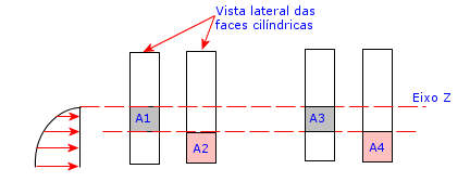 Uma força de rolamento é aplicada às faces cilíndricas, como mostrado esquematicamente na figura. Mantenha em mente que a força de rolamento é aplicada normal à face e que você pode selecionar também arestas circulares de casca. Suponha que as áreas selecionadas sejam A1 = A2 e A3 = A4. A2 receberá mais força por causa da sua localização de intensidade máxima no meio-espaço. De forma semelhante, A4 receberá mais força do que A3. A razão das forças recebidas por A1 e A3 é diretamente proporcional a suas áreas, porque elas ocupam as mesmas posições relativas no meio espaço. O mesmo pode ser dito para A2 e A4.