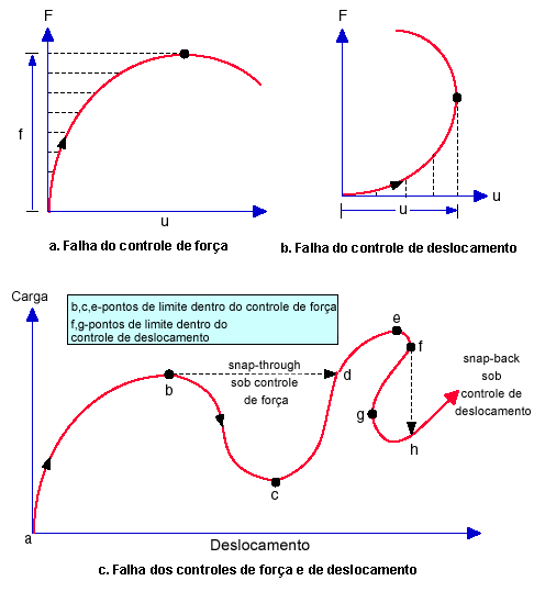 Tanto o controle de força como o de deslocamento serão decompostos nas proximidades dos pontos de virada (conhecidos como "snap-through" para o controle de força e "snap-back" para o controle de deslocamento), como ilustrado nessa figura . Essas dificuldades geralmente são encontradas na análise de flambagem de estruturas, anéis e cascas. O controle de comprimento de arco irá superar essas dificuldades com sucesso.