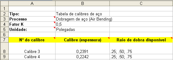 Caso o fator K não seja fornecido na tabela de calibres de chapa metálica, todos os valores de tolerância de dobra assumirão como valor predeterminado o último valor usado.