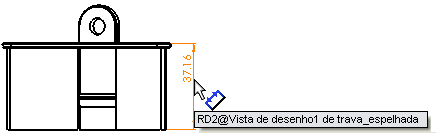 Quando cria peças espelhadas ou derivadas, você pode importar as dimensões do esboço e dos recursos da peça original. Você pode incluir essas dimensões referidas nos desenhos criados a partir da peça espelhada ou derivada.