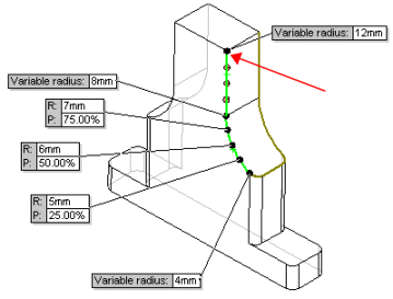 По умолчанию система создает три точки управления, отмечающие равные сегменты, соответствующие 25%, 50% и 75% длины участка кромки между двумя переменными радиусами.