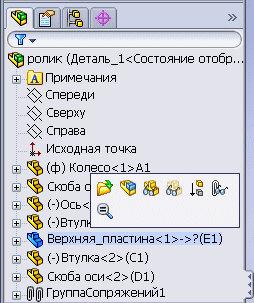 При выборе объектов в графической области или в дереве конструирования FeatureManager контекстные панели инструментов отображаются и дают возможность доступа к часто выполняемым заданиям для этого контекста. Инструменты в контекстной панели инструментов являются набором объектов, ранее располагавшихся в контекстных меню.