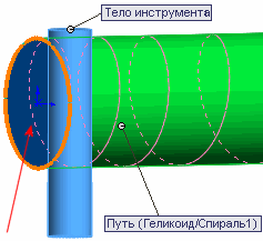 Чтобы во время движения по геликоиду тело инструмента оставалось перпендикулярным к справочной линии, выберите значение Вектор направления для параметра Тип выравнивания траектории и укажите ось, по отношению к которой тело инструмента должно сохранять перпендикулярное положение, например, к плоской торцевой поверхности цилиндра.