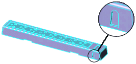 En este ejemplo, la operación rebajada en la parte frontal de la pieza plástica es un área de moldura atrapada que requiere un núcleo. Primero debe crear un croquis en un sólido de herramienta (en este caso, el Sólido de cavidad) para definir el esquema del núcleo. Luego utilice la herramienta
