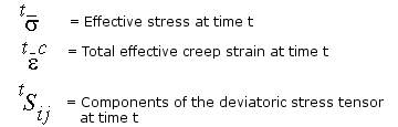 Para un análisis numérico de fluencia, donde puede aplicarse la carga cíclica basándose en la regla de rigidización de deformación unitaria, las velocidades de deformación unitaria de fluencia actuales se expresan como una función de la tensión actual y la deformación unitaria de fluencia total: