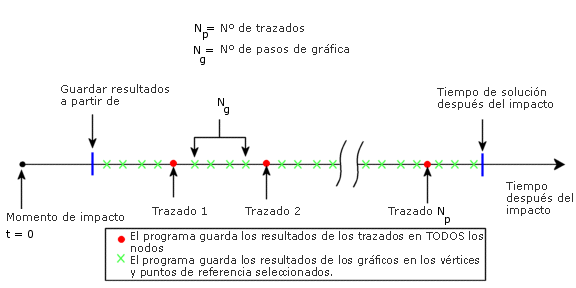 Establece los instantes de tiempo en los que el programa guardará los trazados resultantes (para todos los nodos) y los resultados de gráficos (en los vértices y puntos de referencia seleccionados).