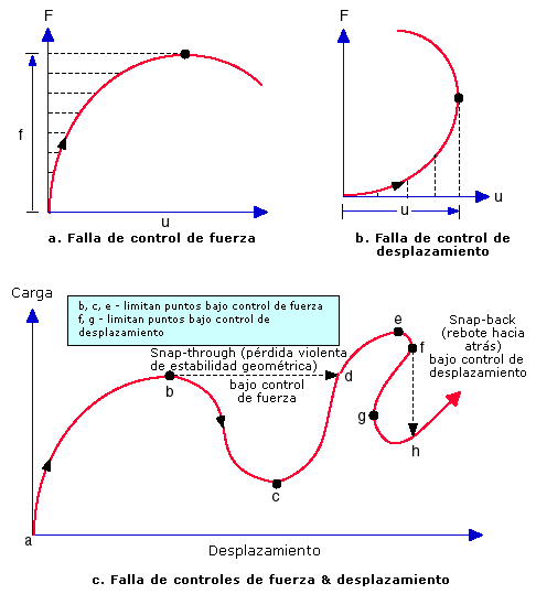 Tanto el control de fuerza como el control de desplazamiento se desglosan en las proximidades de los puntos de cambio (conocidos como snap-through, que es una pérdida violenta de estabilidad geométrica, para el control de fuerza y snap-back, rebote hacia atrás, para el control de desplazamiento) como en esta figura
