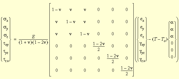 La forma más general de las relaciones isotrópicas de tensión-deformación unitaria, incluyendo los efectos térmicos, se muestra a continuación: