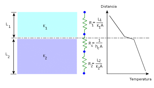 La conductancia hc es similar al coeficiente de transferencia de calor por convección y tiene las mismas unidades (W/m2 oK). Si DT es la diferencia de temperatura a lo largo de una interfaz de área A, entonces la tasa de transferencia térmica Q está dada por Q = A hc DT. Si se usa la analogía eléctrico-térmica, se puede expresar que Q = DT/Rt, donde Rt es la resistencia a contacto térmico y está dada por Rt = 1/(A hc).