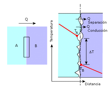 A través de la interconexión entre las dos caras en contacto, existen dos modos de transferencia térmica. El primero es la conducción a través de puntos de contacto 'sólido a sólido' (Qconducción), el cual es muy efectivo. El segundo es la conducción a través de las separaciones con contenido gaseoso (Qseparación) que, debido a su baja conductividad térmica, puede ser deficiente. Para tratar la resistencia a contacto térmico, se ubica una conductancia interfacial, hc, en serie con los medios conductores a ambos lados, según se muestra en la siguiente figura.