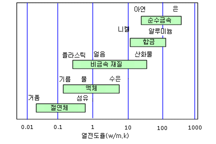 아래 그림에서는 정상 온도 및 압력에서 액체, 비금속 고체, 순수 금속의 열전도율 값 범위를 보여줍니다.