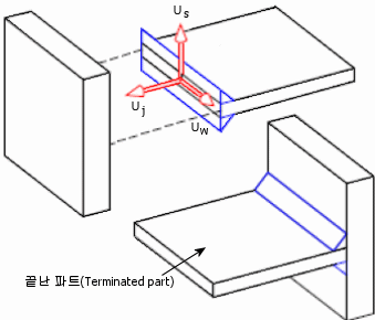 - 용접 축, Uw: 축이 용접 부위 방향에 평행합니다. 그 방향은 Uw = Us x Uj로 정의됩니다.