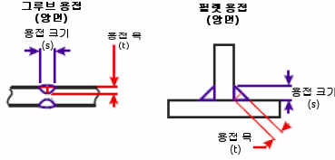 그루부 용접의 조인트 관통 치수. 필렛 용접의 위에서 아래까지 거리(용접 레그).
