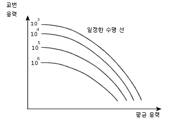 Haigh 도표로 불리우는 다음 도표는 싸이클의 평균 응력이 실패에 주는 영향을 보여줍니다.
