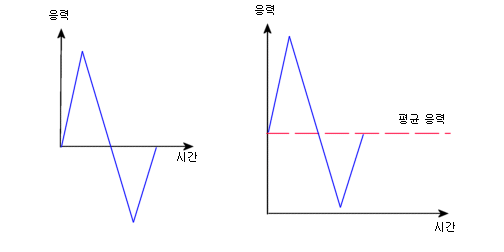 응력 싸이클의 교번응력이 싸이클의 응력 영역의 1/2로 계산됩니다. 응력 싸이클로 인한 손상도는 교차 응력뿐만 아니라 평균 응력에 따라 다릅니다. 예를 들어, 아래의 두 싸이클에 같은 교차 응력이 있으나 평균 응력이 다르므로, 손상도가 다릅니다.