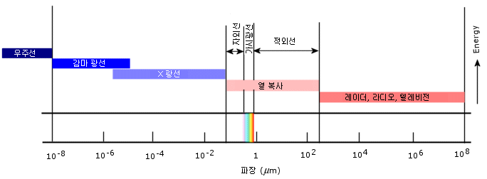 열복사는 물체의 온도에 의해 전자기파 형태로 물체에서 방사되는 열 에너지입니다. 절대 0도 이상의 온도를 갖는 모든 물체는 열 에너지를 방사합니다. 전자기파는 진공 상태에서 이동하므로 복사 작용에 매체가 필요없습니다. 다음 그림은 열 복사의 범위(파장)를 다른 수단(X-레이, γ-레이, 우주선 등)으로 방출되는 복사와 비교하여 보여줍니다.