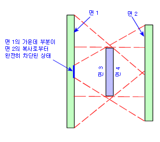 두 요소 면 간의 복사는 제3 요소 면에 의해 차단될 수 있습니다. 이러한 경우, View Factor는 0이 됩니다. 이 프로그램에서는 아래 그림에서 볼 수 있듯이 모든 지정 면 중에서 차단을 고려합니다. 올바른 차단을 고려하기 위해 방사 요소에 포함할 면을 선택해야 합니다. 아래 예제에서, 면 3, 4는 면 1, 2 간의 복사를 부분적으로 차단합니다. 면 1, 2, 3만 선택할 경우 잘못된 결과를 얻게 됩니다.