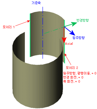 이 모델은 축대칭입니다. 모델의 1/2 또는 1/4을 해석할 수 있습니다. 대칭 구속조건은 선택한 면에 평행 이동과 회전 이동 조건을 자동으로 적용합니다.