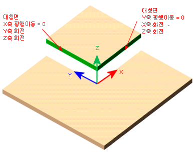 쉘 모델에서 대칭 기능을 사용하려면 대칭면과 일치하는 면은 수직 방향으로 이동해서는 안되고 다른 두 직교 방향을 기준으로 회전하지 못하도록 구속해야 합니다. 대칭면은 서로 직각을 이뤄야 합니다.